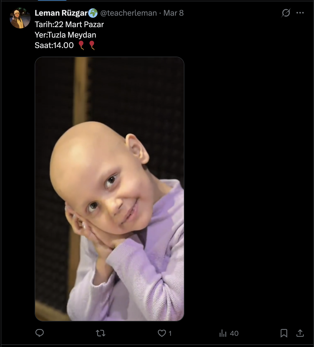 Almira’nın annesi Leman Rüzgar, sosyal medya platformu X’ten yaptığı paylaşımda Tuzla Belediye Başkanı Av. Eren Ali Bingöl ve Tuzla Belediyesi’ne seslenerek, “Balonlar bu sefer Almira için 22 Mart’ta Tuzla Meydanı’nda uçuyor. Almira kanseri yendi. Doğum gününde bir balon ile bize eşlik eder misiniz?” dedi.