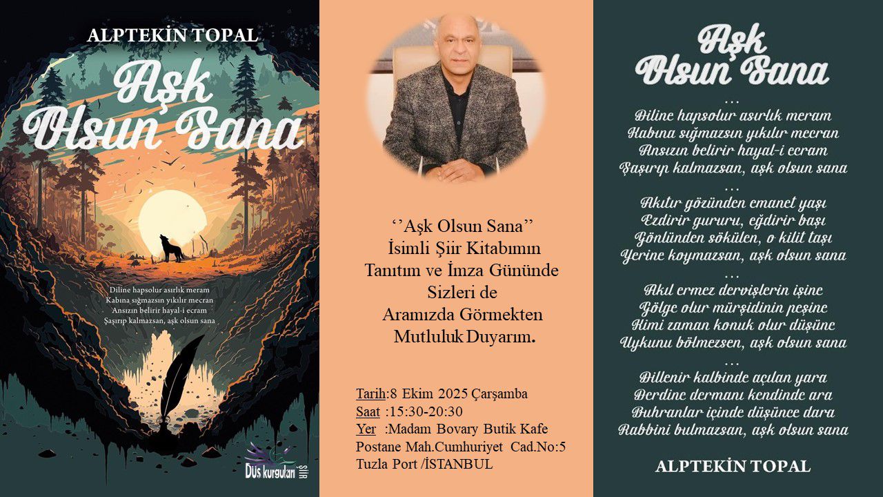• "Aşk Olsun Sana" isimli şiir kitabımın tanıtım ve imza gününde sizleri aramızda görmekten mutluluk duyarım.    Alptekin TOPAL Eğitimci / Şair- Yazar
