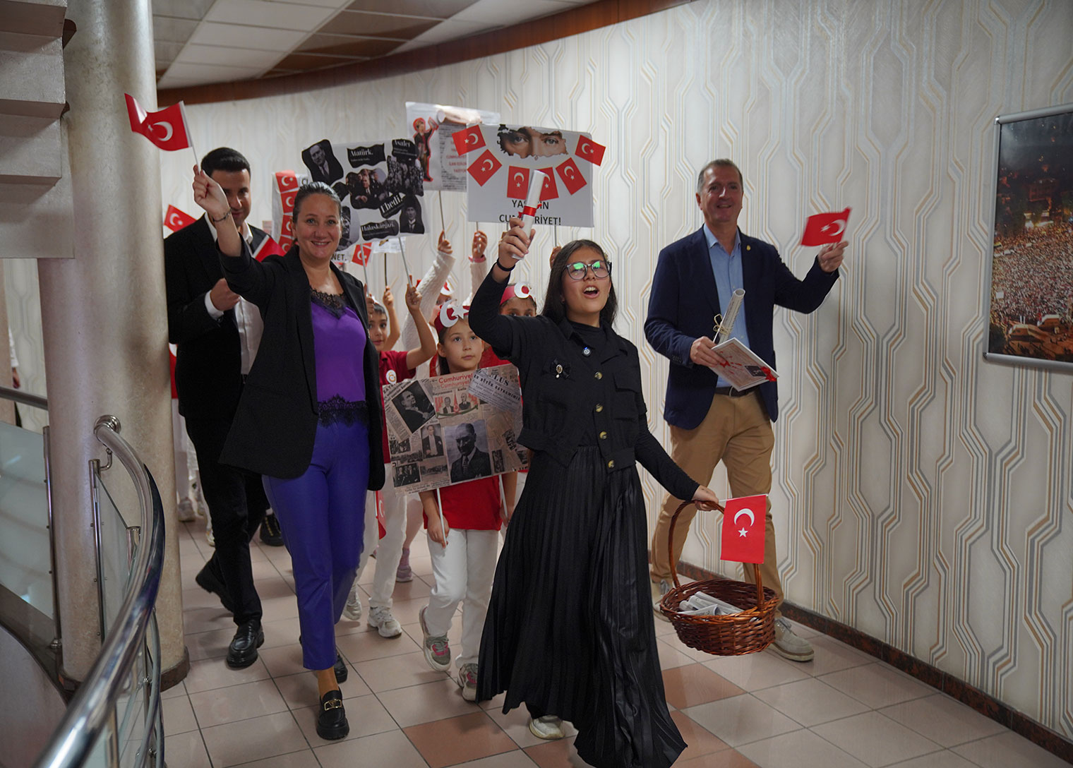 Etkinlikler sergiyle sınırlı kalmadı. Minik öğrenciler belediyedeki tüm müdürlükleri ziyaret ederek, Cumhuriyet Bayramı coşkusunu sloganlarla paylaştı ve çalışanlara el yapımı kartlar ile küçük hediyeler sundu.