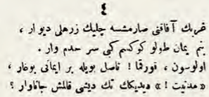 Osmanlıca son dörtlükte durum, açık seçik gözüküyor. Dörtlüğün ikinci kelimenin sonunda “ڭ” harfi var. Dediğin şeklinde yazılıyor zira mevcut alfabemizde “ڭ” harfinin yerine yazılacak bir harfimiz yok. Osmanlıcadaki “ڭ “harfine günümüzde “Nazal n” deniyor ancak bu nazal kelimesi Fransızcadır. Türkçesi varken ilgili hocalar, buna ısrarla “Nazal n” diyorlar. Türkçemizde bu harfin yerini alacak bir şekil var ama alfabe de yok. Alfabedeki harflerle yazmak ise “ng” şeklinde mümkündür. Özellikle orta Anadolu başta olmak üzere ülkenin bazı kesimlerinde, bu harf,” Bana, sana, ona, buna, şuna, ona.” kelimelerinde kullanılan sesin şeklidir. Türkçe söylemek gerekirse “Geniz n” si demeliyiz.