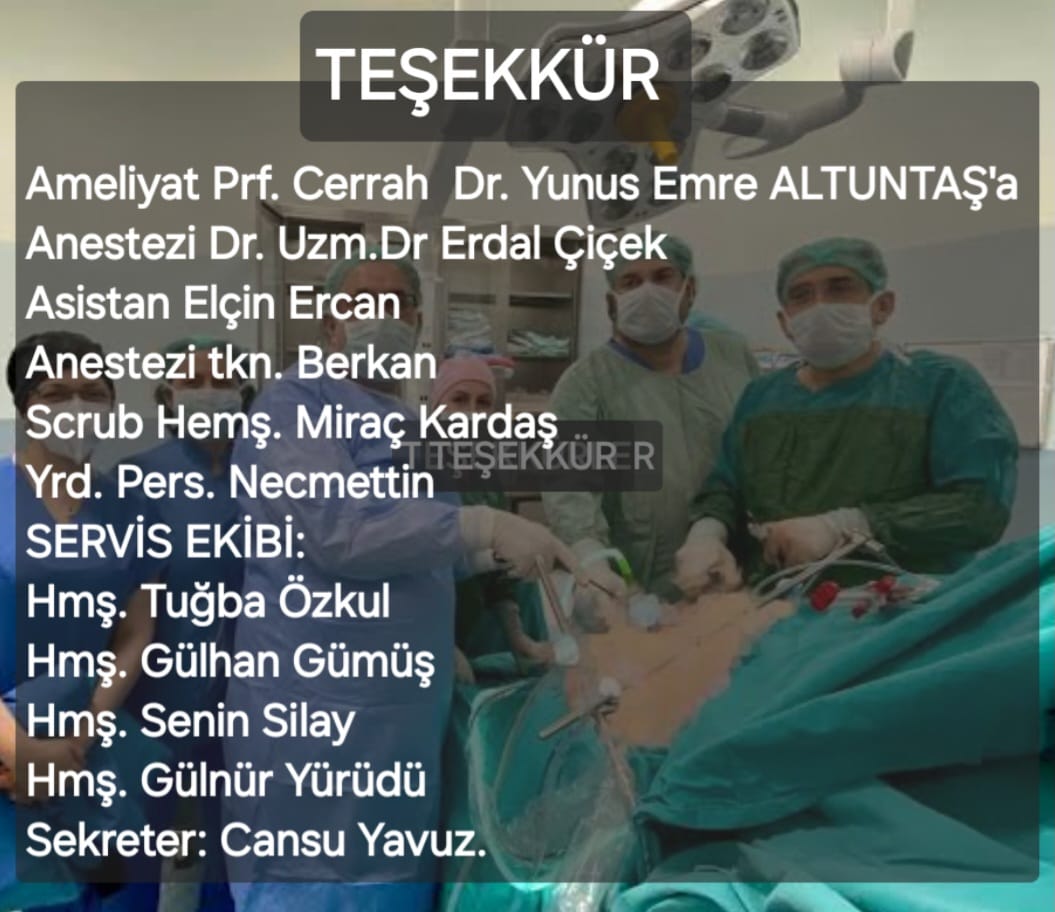 Sağlık Personellerimiz; Anestezi Tkn. Berkan Bey'e, Ameliyat Hmş. Miraç Kardaş’a, Yrd. Pers. Necmettin Bey'e, Servis Personellerimiz; Hmş. Tuğba Özkul’a, Hmş. Gülhan Gümüş’e, Hmş. Selin Silay’a, Hmş. Gülnür Yürüdü’ye, Sekreter Cansu Yavuz’a, Ameliyat ekibi ve servis çalışanlarına çok teşekkür ederim.