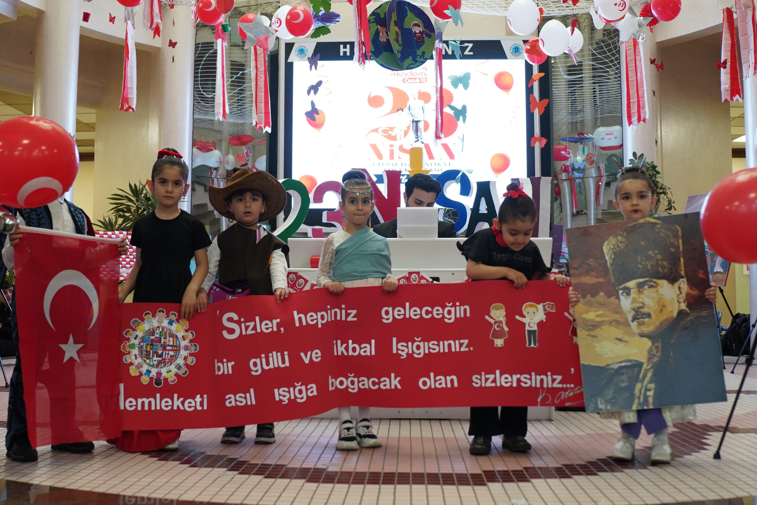 Belediye binasını gezen çocuklar, birimlere ziyaretlerde bulunarak Türk bayrağı dağıttı. Belediye binasında 23 Nisan etkinlikleri için kurulan özel sergi ve etkinlik alanına geçen çocuklar, saygı duruşu ve İstiklal Marşı’nı okudular.
